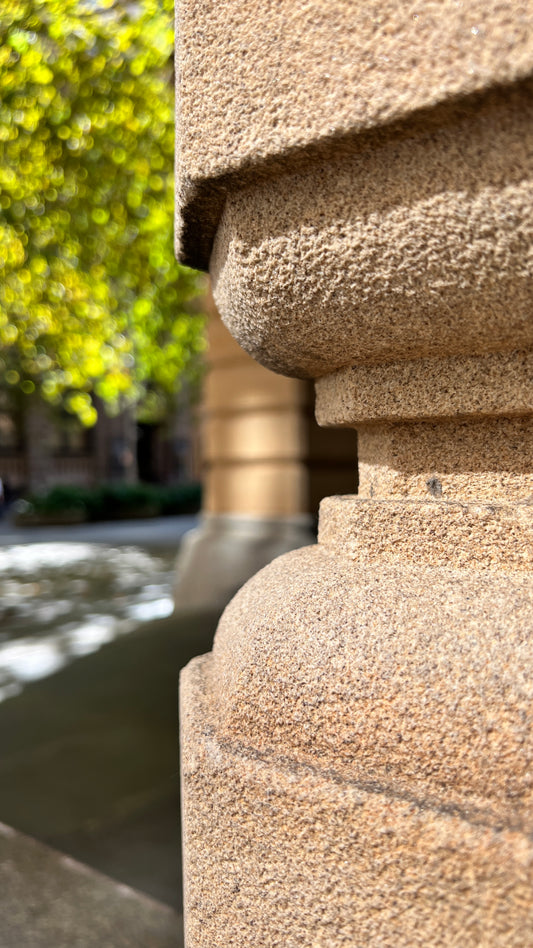 The details in the pillars of this historic building and the rough texture of the sandstone, its blocky angles and subtle curves inspired a series drawing on these features - stackable bands and one-of-a-kind rings with irreplaceably unique stones.