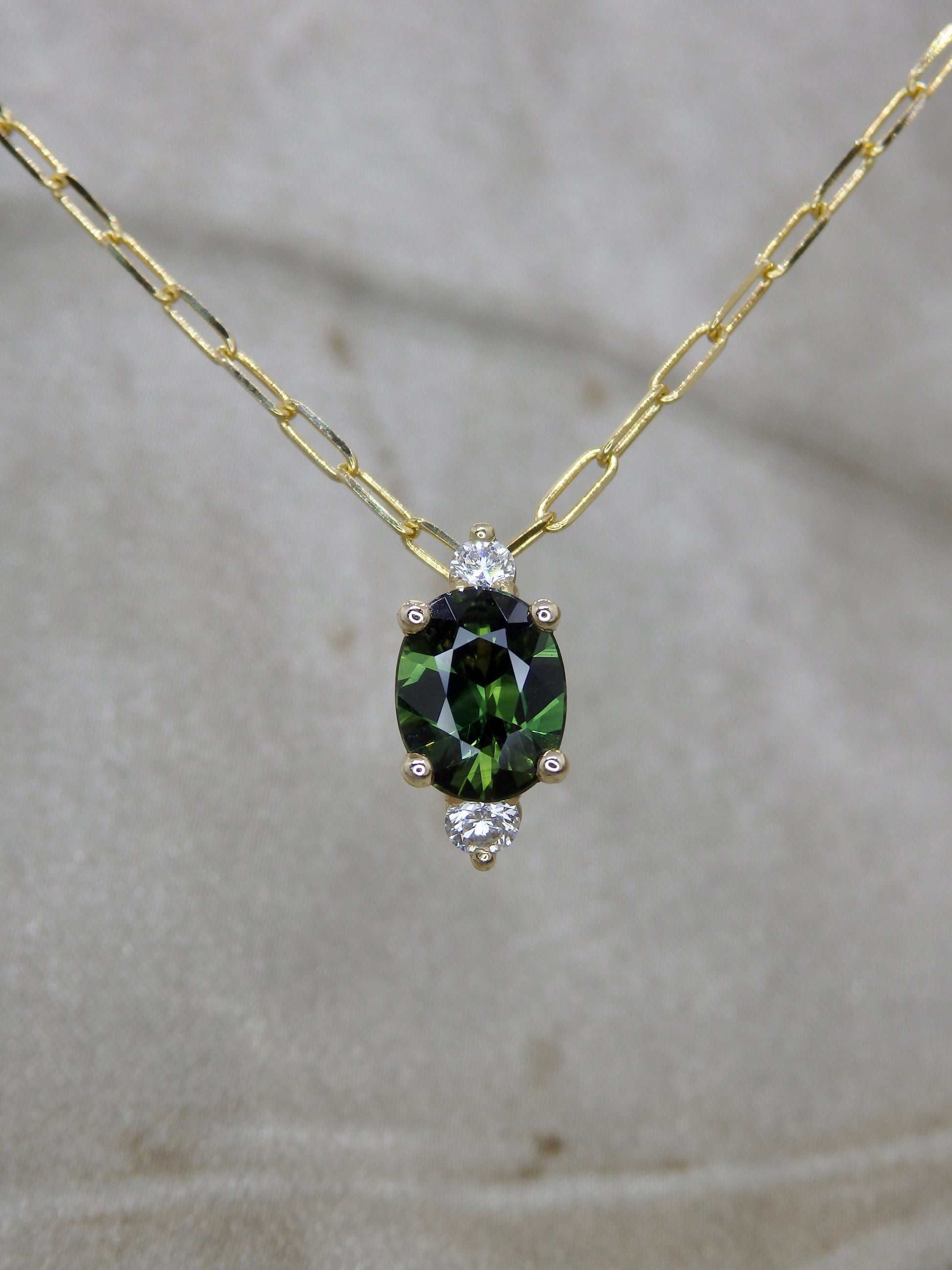 This 1.35ct Oval green Australian Sapphire swings between two round brilliant cut diamonds F/VS on a sliding 14ct yellow gold pendant. A beautiful forest-green and cut to sparkly perfection, this piece has an everyday bohemian feel.