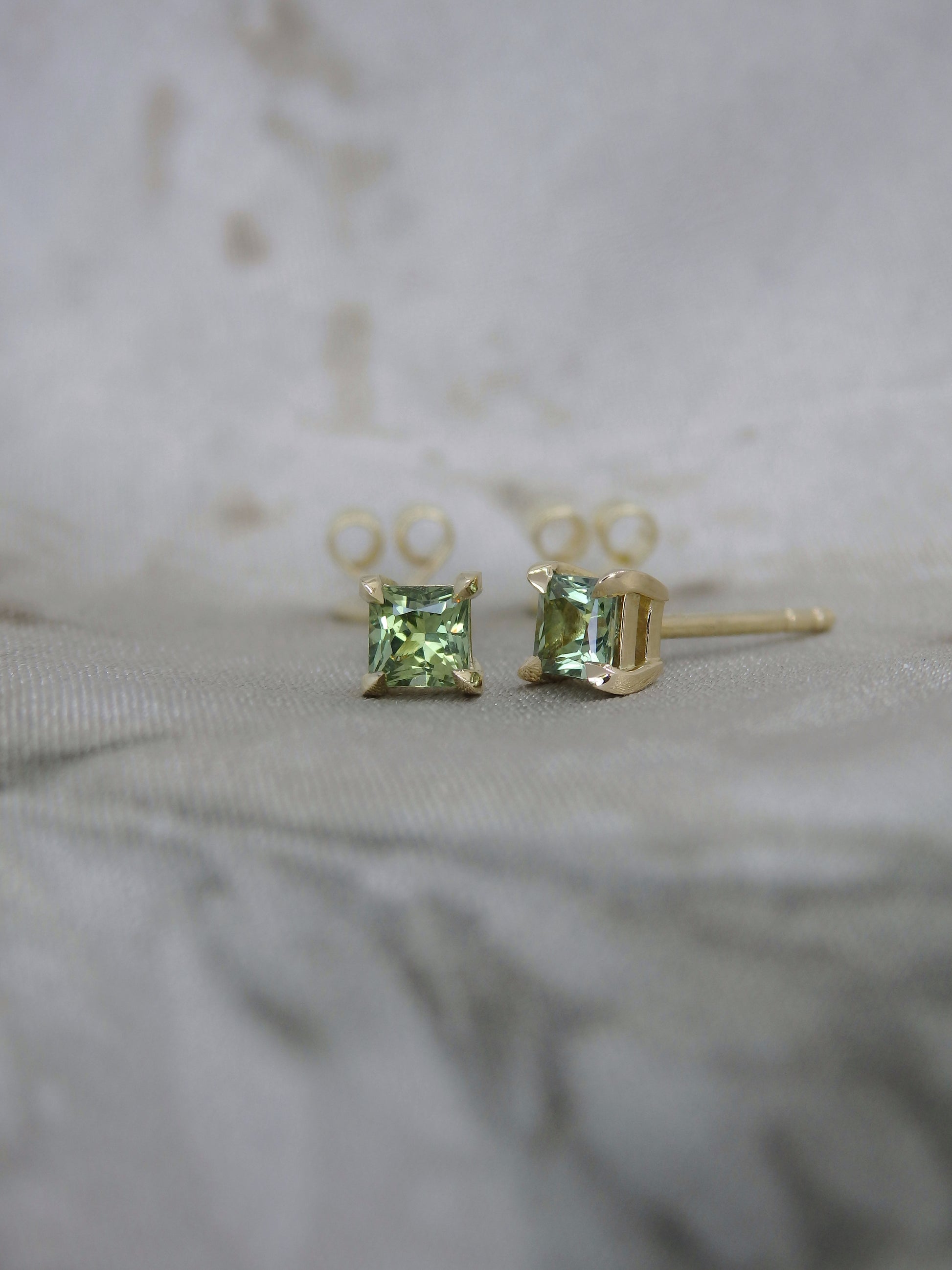 18ct Princess Cut Green Australian Sapphire Stud Earrings