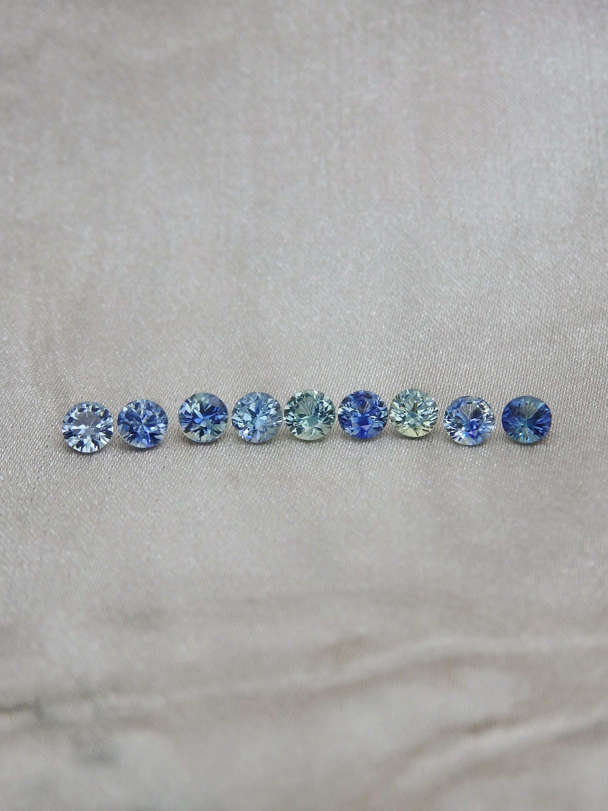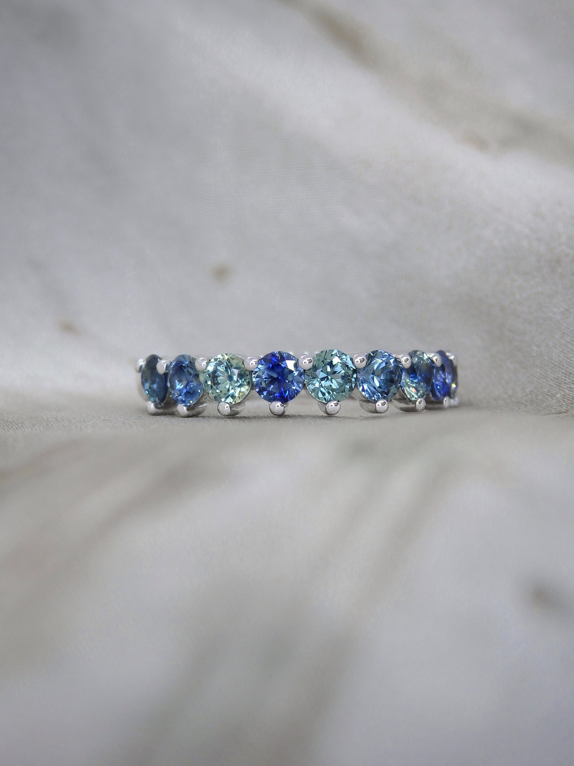 In multi-tones of blues, light teals and subtle greens it’s like having the ocean on your finger. Each of these 3mm sapphires is unique in its own right, colours shifting with movement and light.