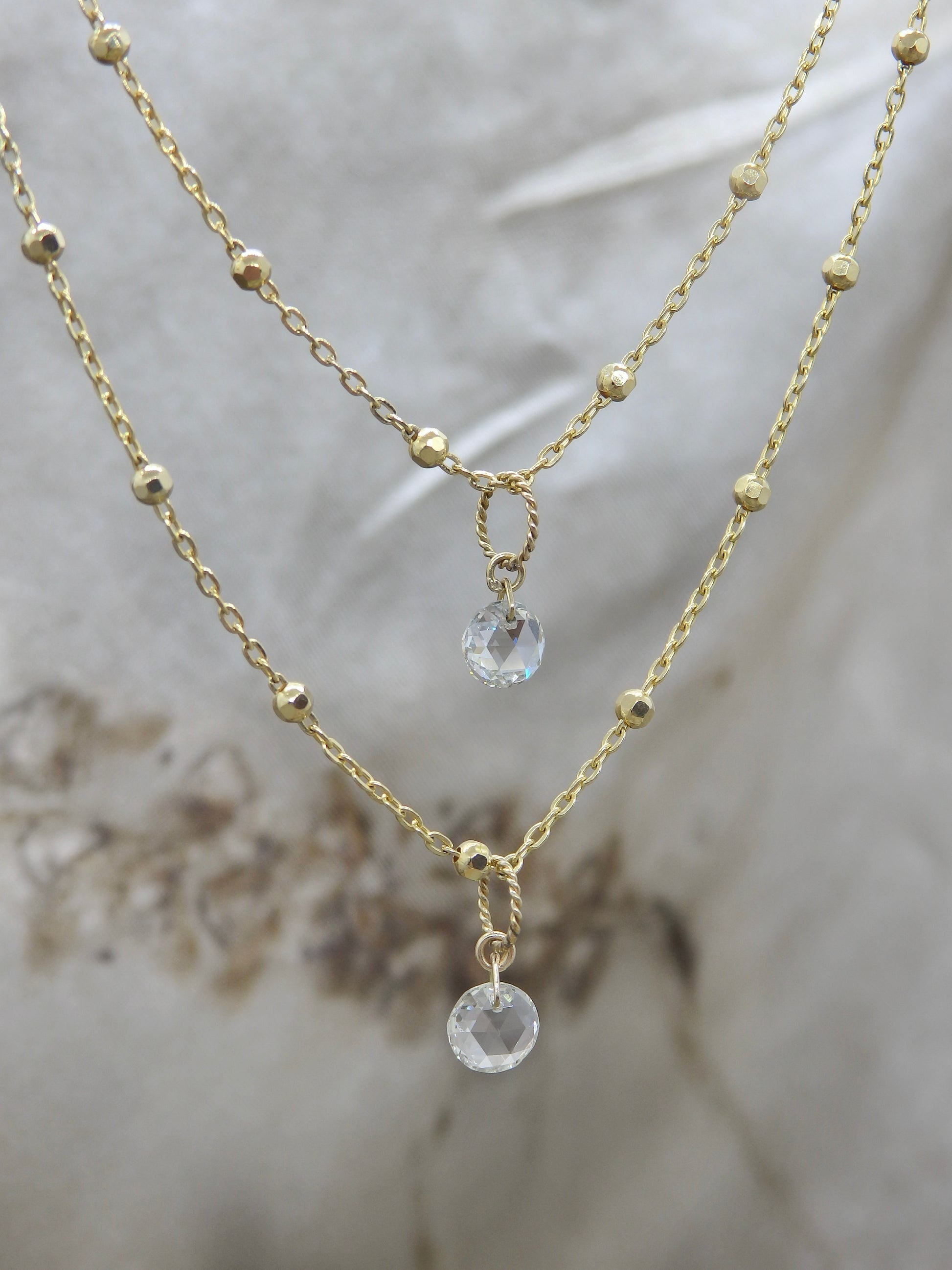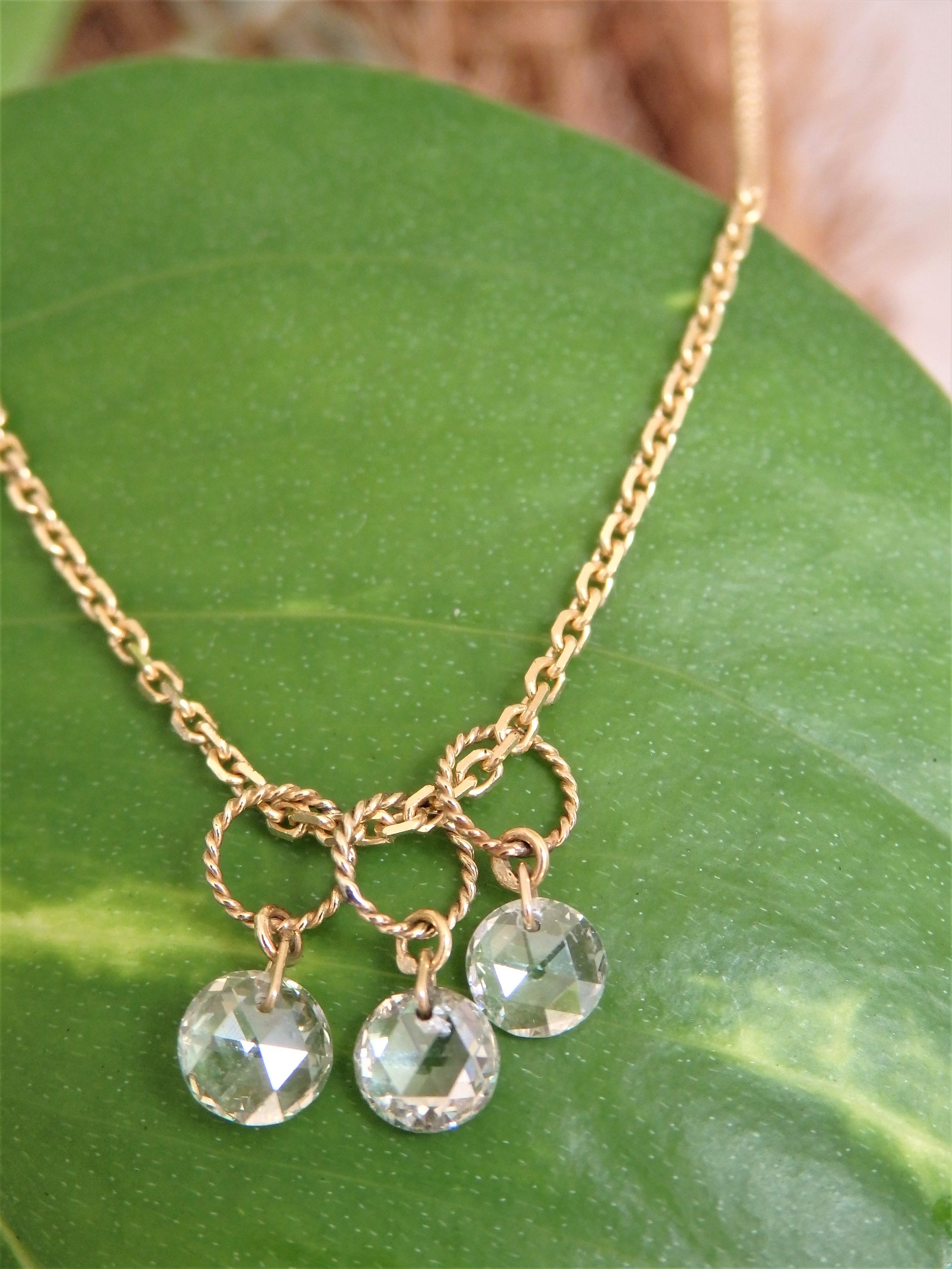 These delicate Rose Cut Diamond pendants are a dainty addition to a neck stack. Hanging off a fine rope-weave 18k gold ring, they are a casual, leave-on sparkle.
