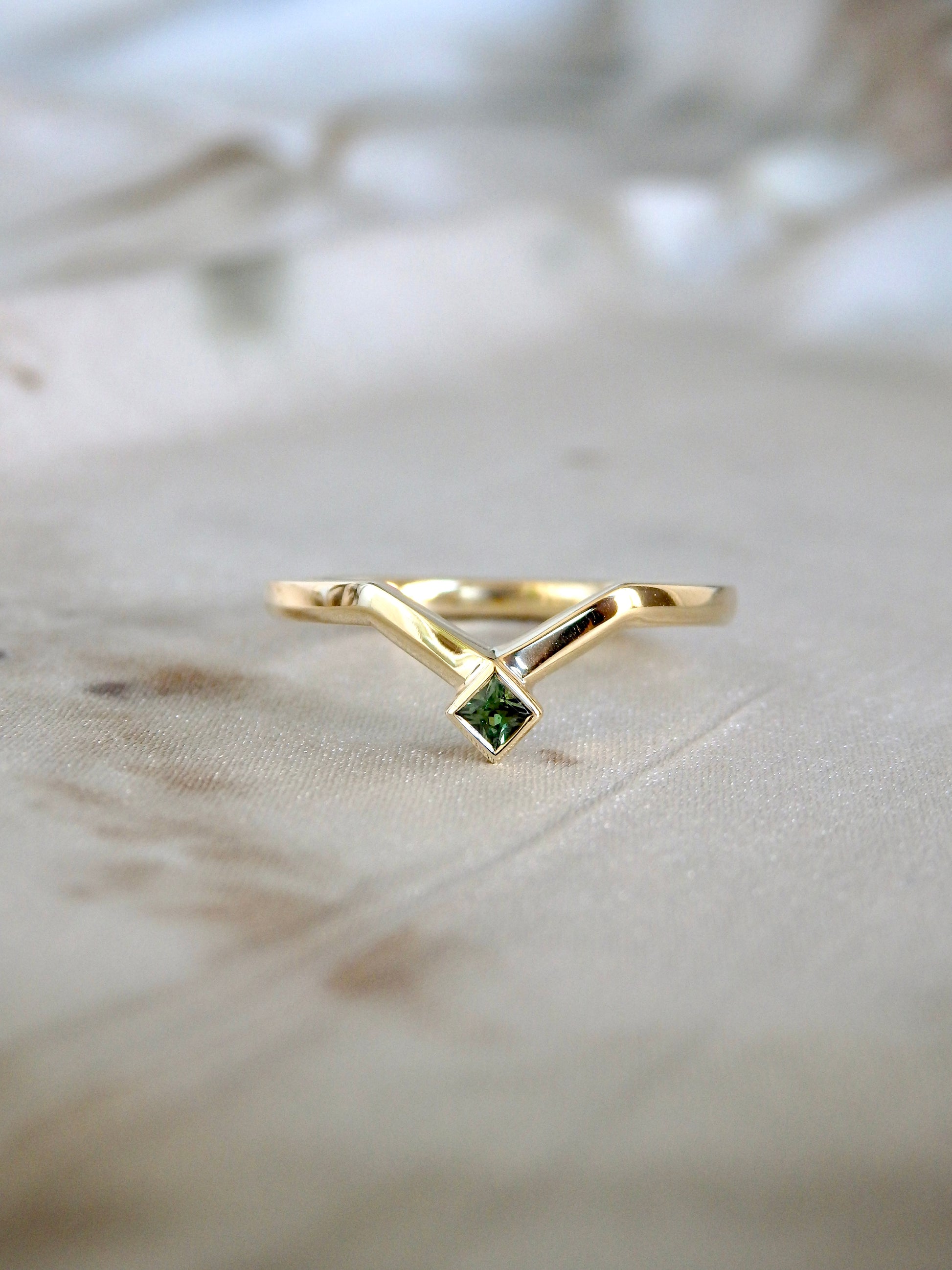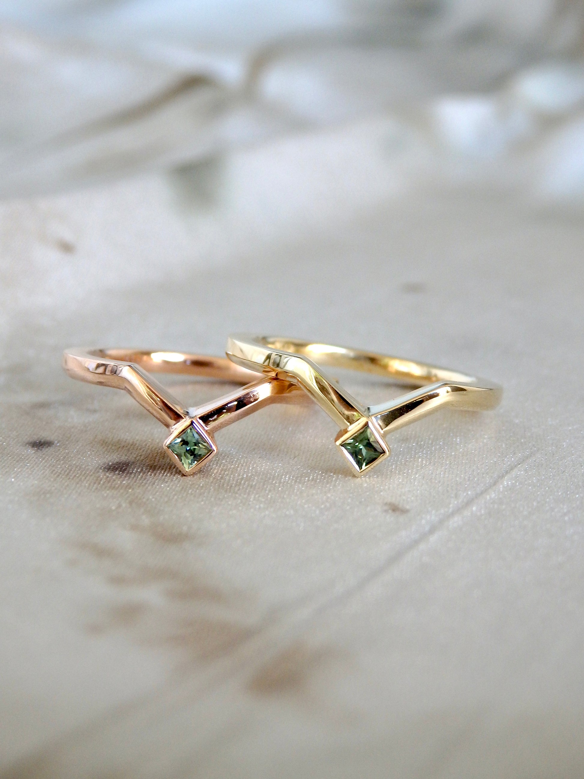 This geometric band features a princess-cut Green Australian Sapphire sitting pride of place, leading a slim vector up the finger. Originally made to perfectly stack with the Hexagonal Engagement ring “Rumi”, this little band is versatile and lends a geometric edge to any stack.
