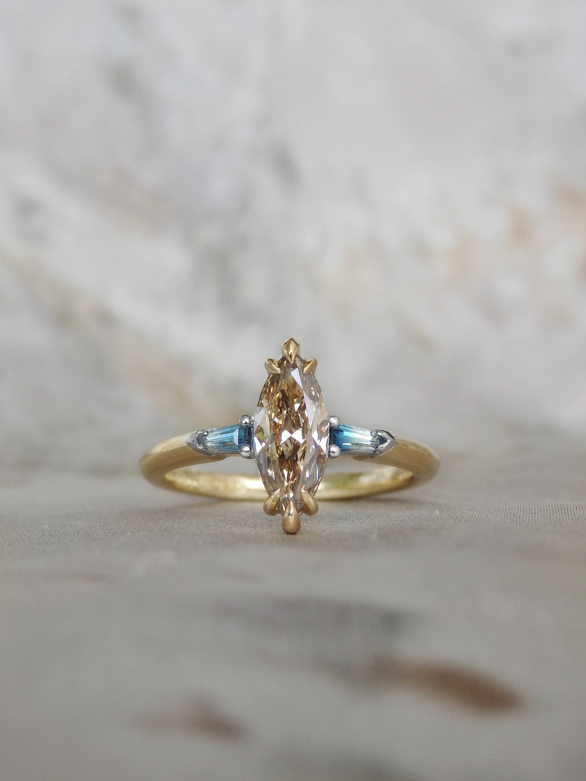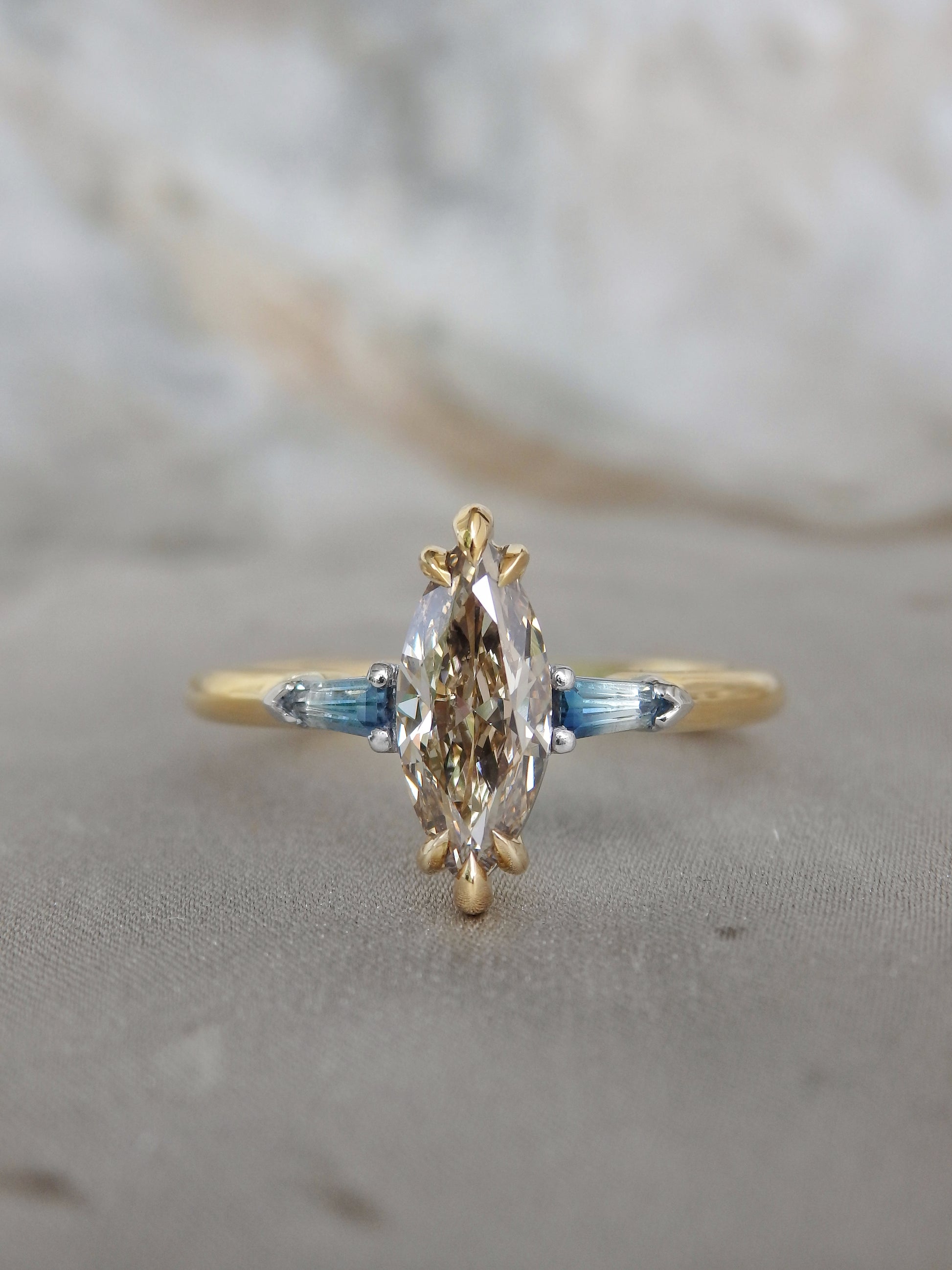 Driftwood 1 - “Cellito” Argyle Marquise Champagne Diamond & Ombré Australian Parti Sapphire Trilogy Engagement Ring