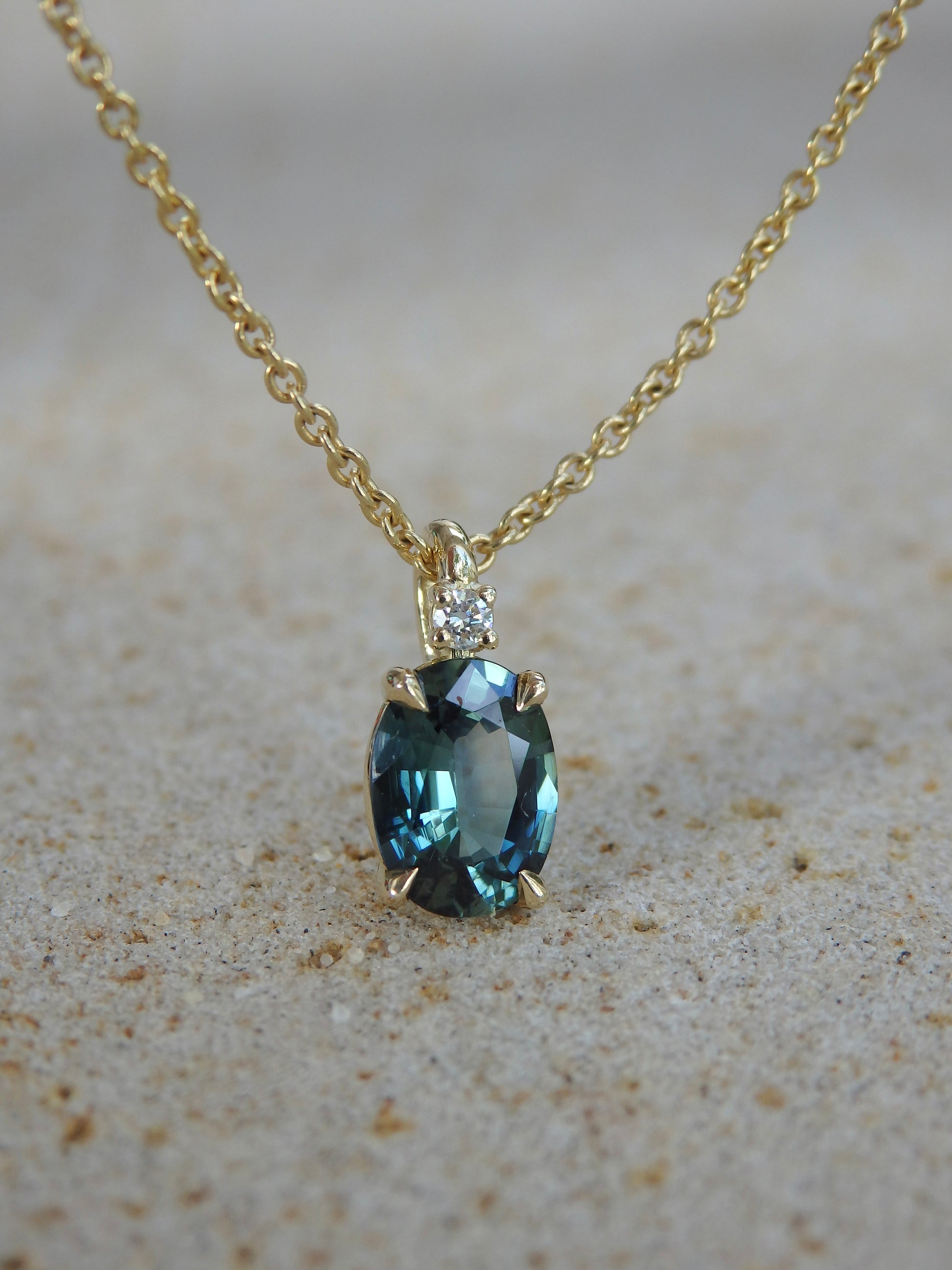 Oval Teal Australian Sapphire & Diamond Pendant, 18ct Yellow Gold