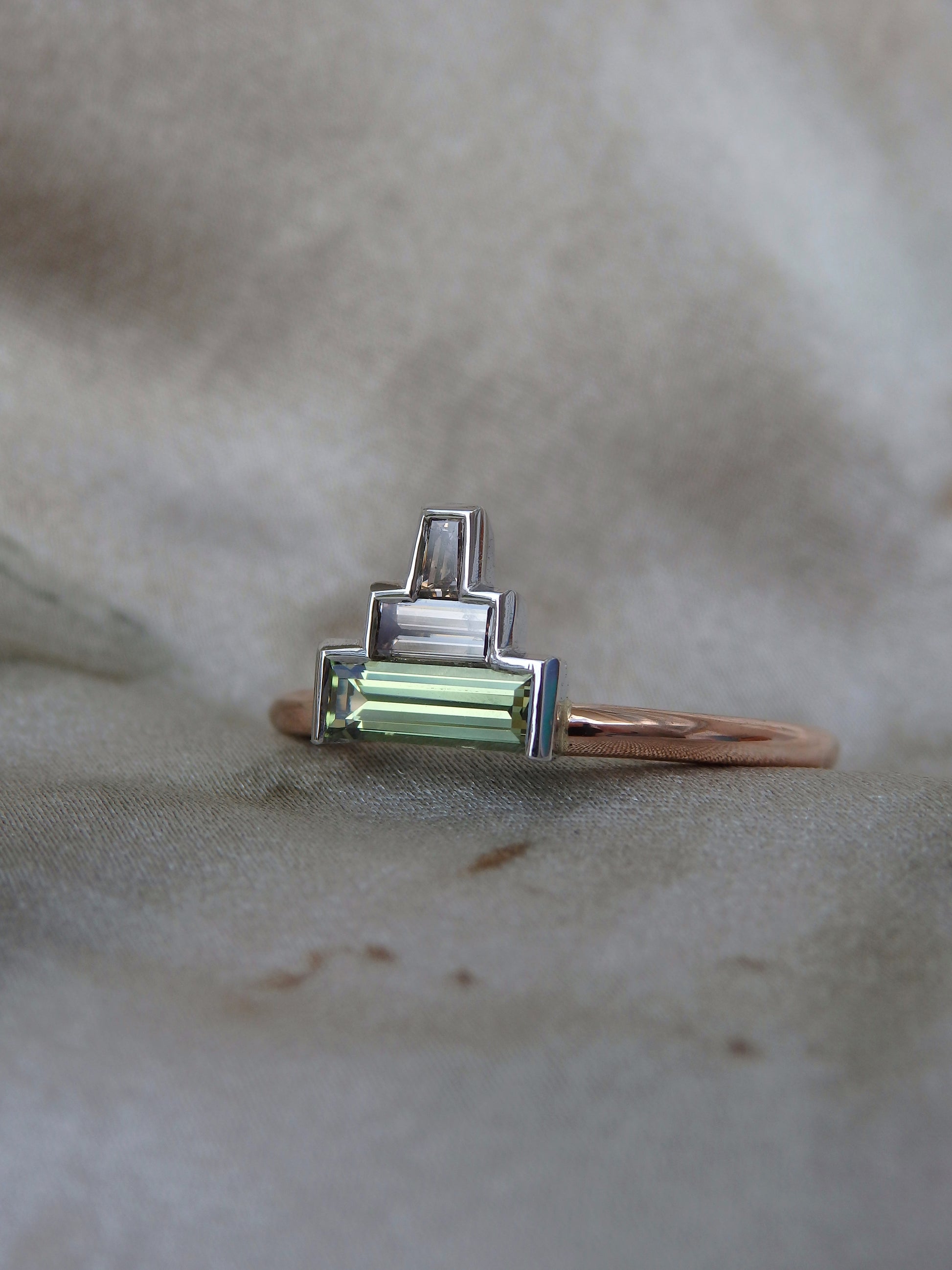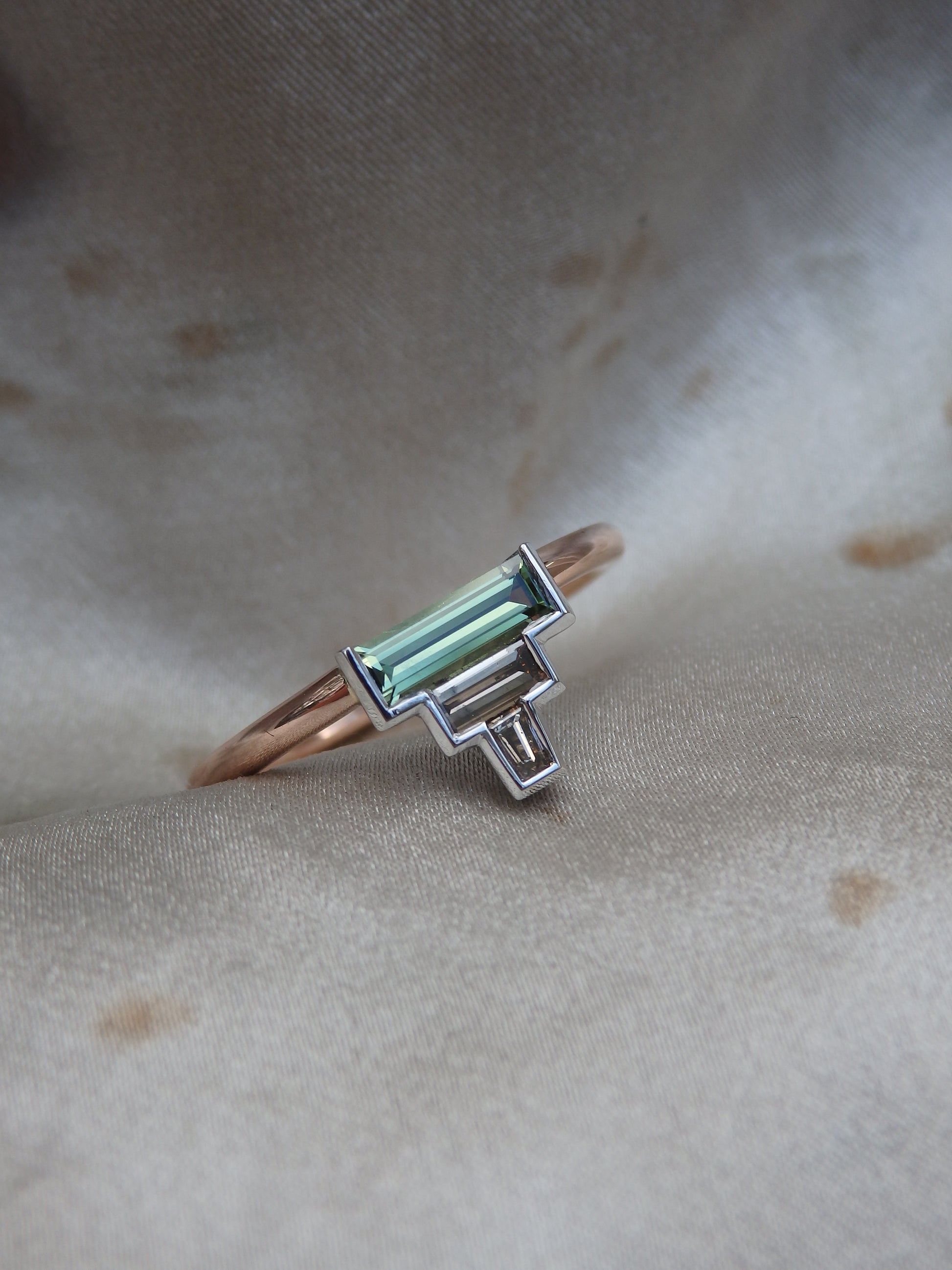 This versatile low-profile stacker can be used as a bridal set enhancer, a minimalist engagement ring or an everyday dress ring. Crafted in durable platinum and warm rose gold, the contrast between the grassy Australian Baguette Sapphire and the rich tones of the Argyle Baguette Diamonds lend a natural, earthy feel to the ring.