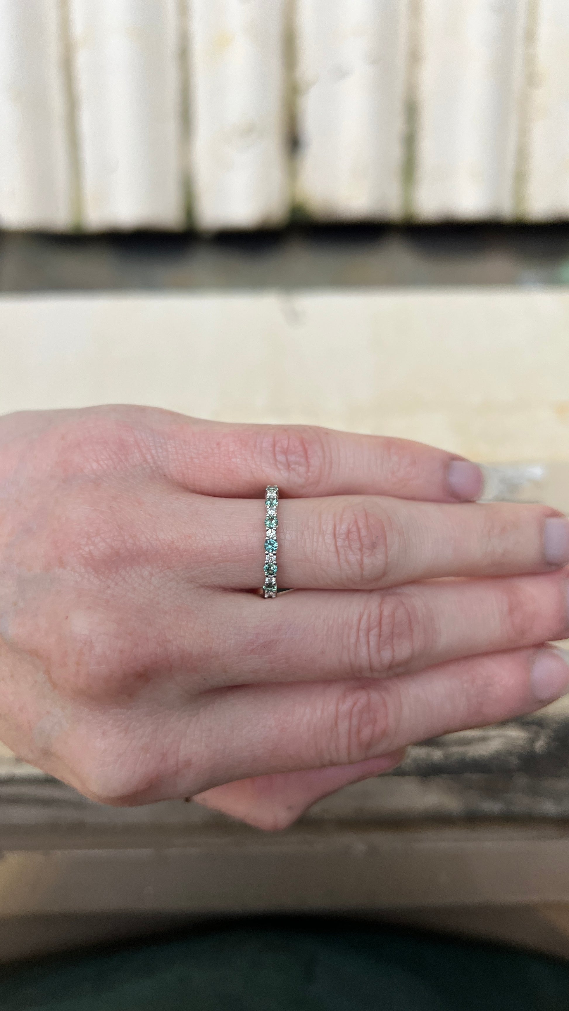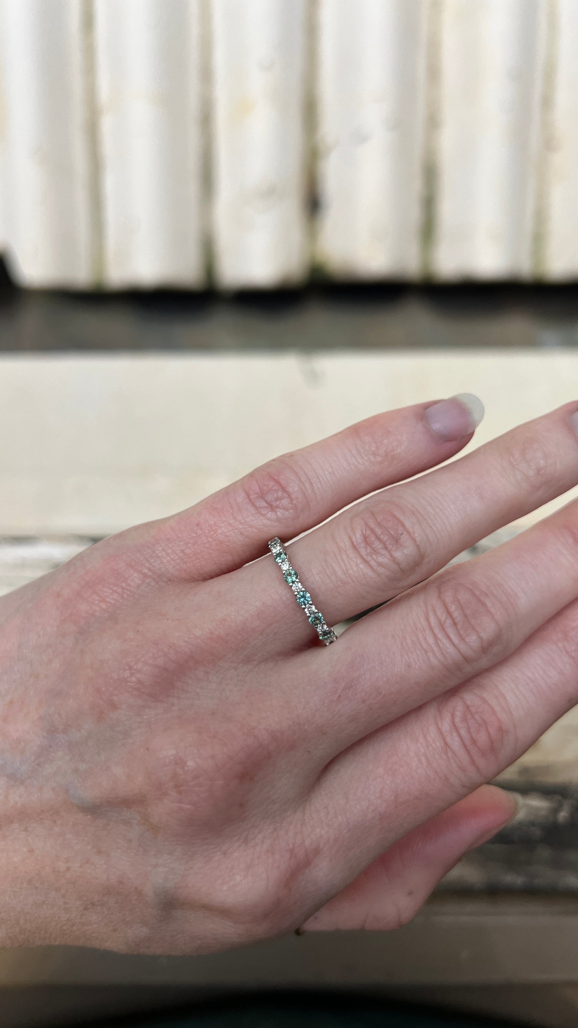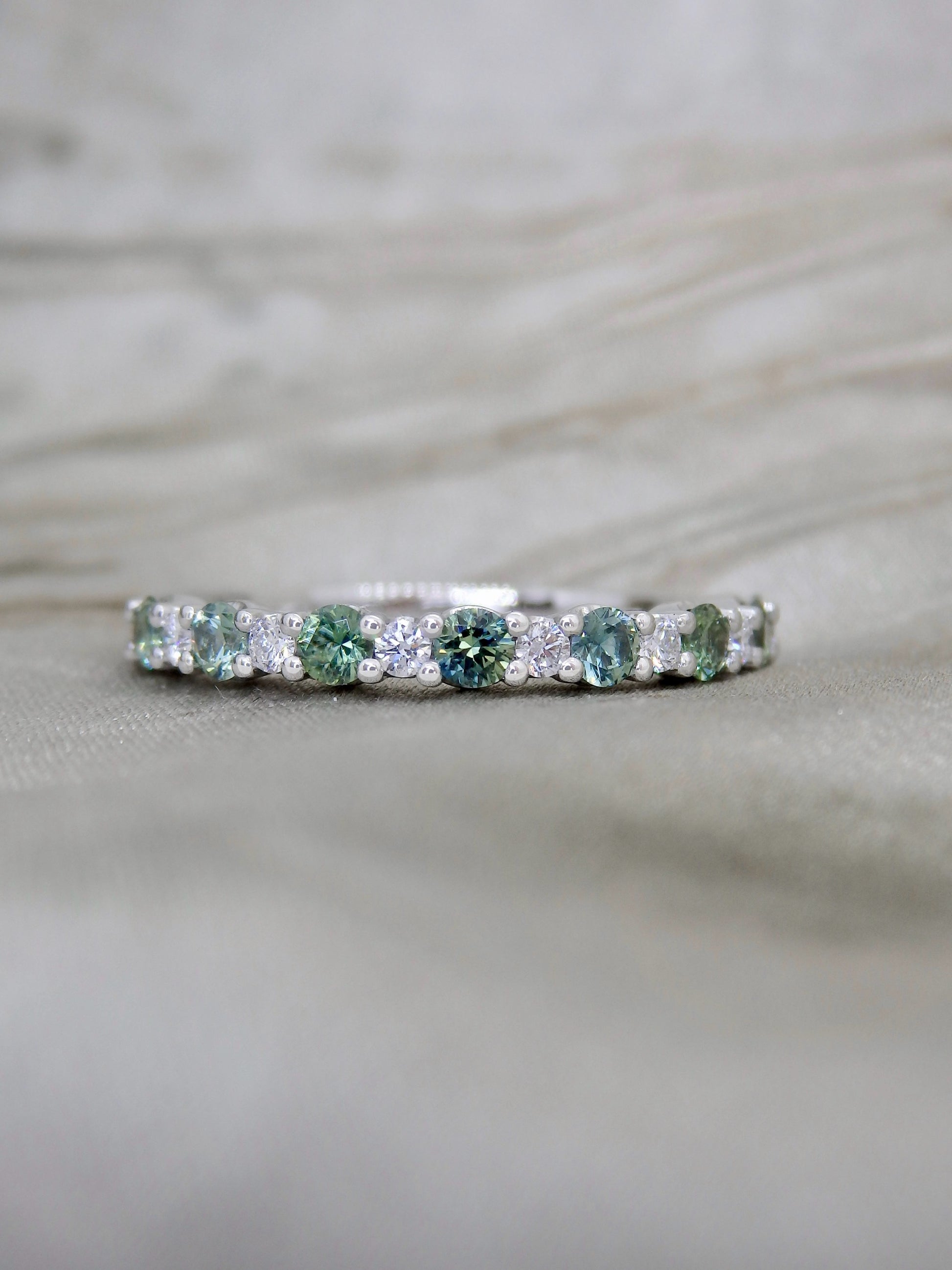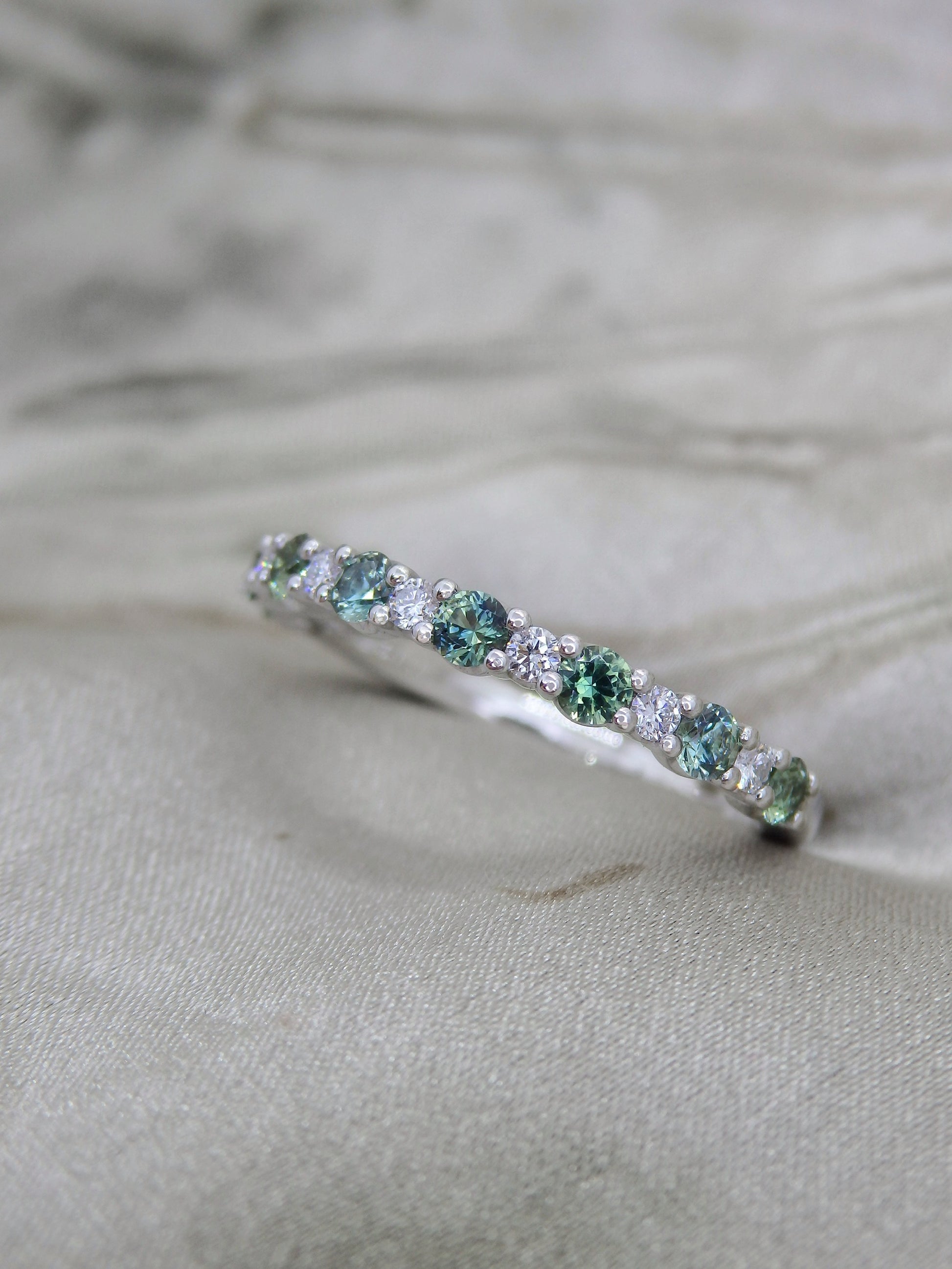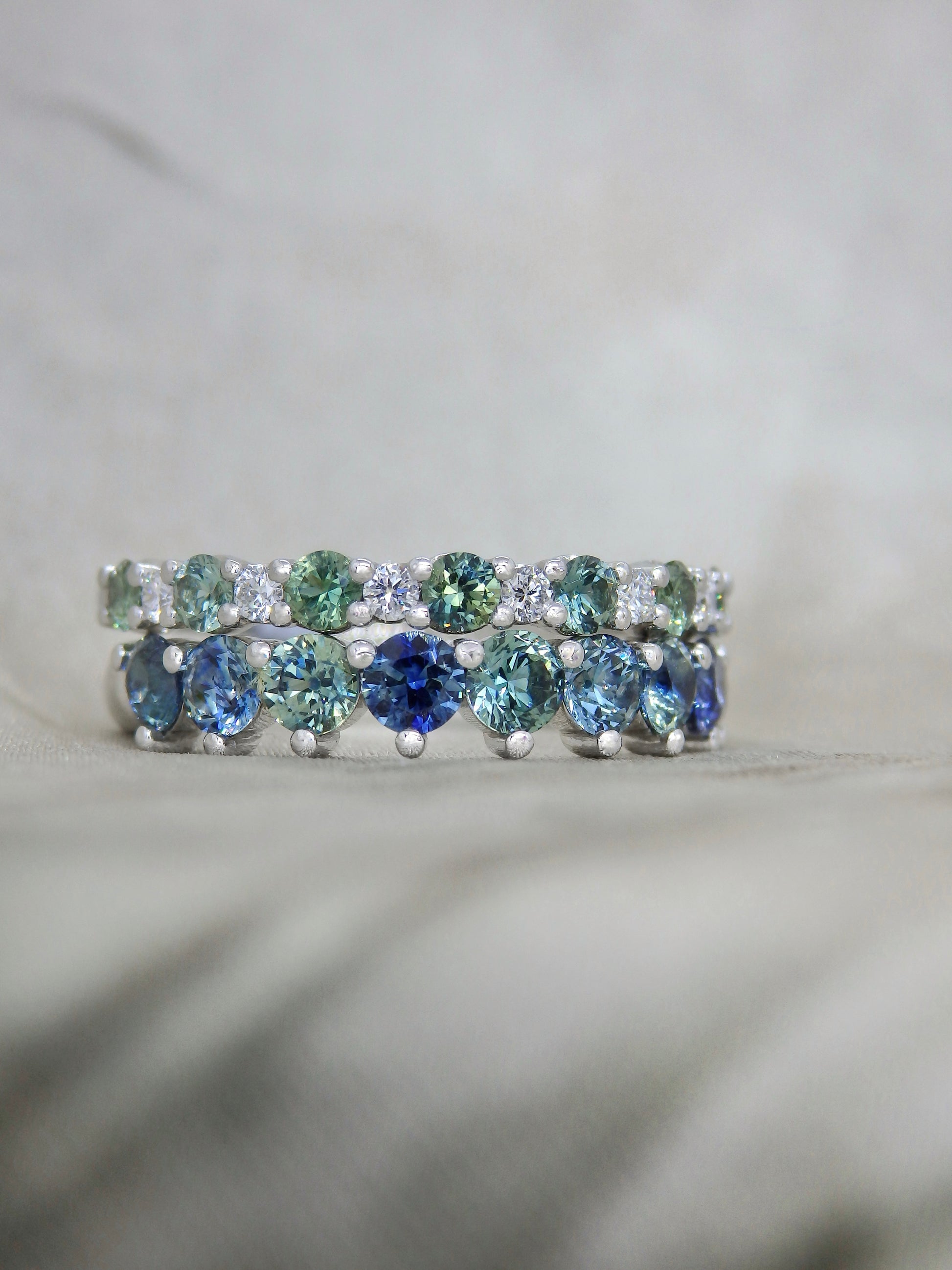 Undulating seafoam sapphires and white diamonds, point-set in polished platinum.